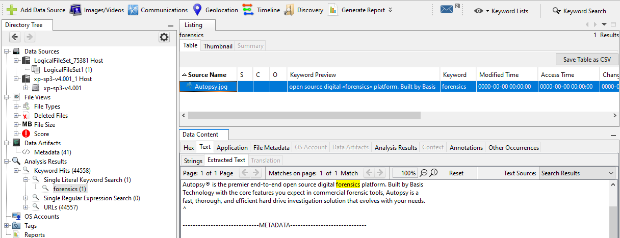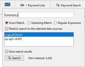 Individual keyword or regular expressions can quickly be searched using the search text box widget. You can select "Exact Match", "Substring Match" and "Regular Expression" match. See the earlier Creating Keywords section for information on each keyword type, as well as Limitations of Ad Hoc Keyword Search. The search can be restricted to only certain data sources by selecting the checkbox near the bottom and then highlighting the data sources to search within. Multiple data sources can be selected used shift+left click or control+left click. The "Save search results" checkbox determines whether the search results will be saved to the case database.