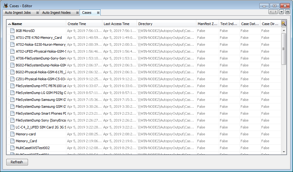 The Cases panel shows information about each auto ingest case - the name, creation and last accessed times, the case directory, and flags for which parts of the case have been deleted.