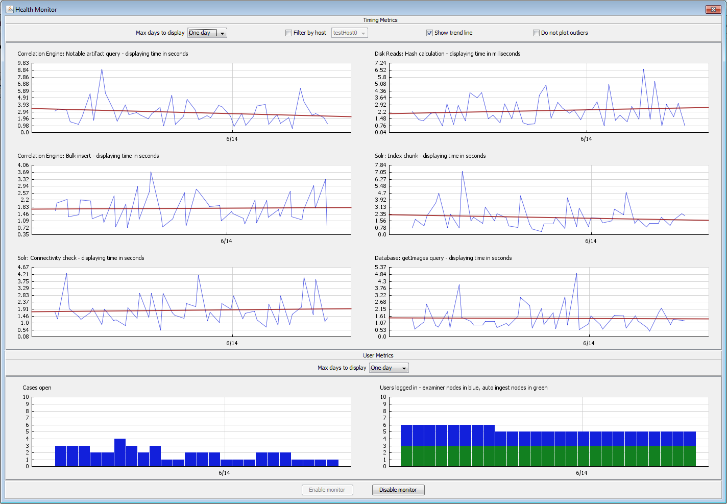 This will enable the health monitor metrics on every node (both auto ingest nodes and examiner nodes) that is using this PostgreSQL server. Once enabled, the monitor will display the collected metrics.