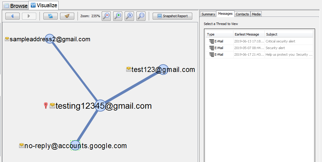 The options at the top allow you to clear the graph and resize the graph. The nodes in the graph can be dragged around and nodes and edges can be selected to display their messages or relationships in the right side tab. For example, in the image below only one node has been selected so the Messages viewer is displaying only messages involving that email address.