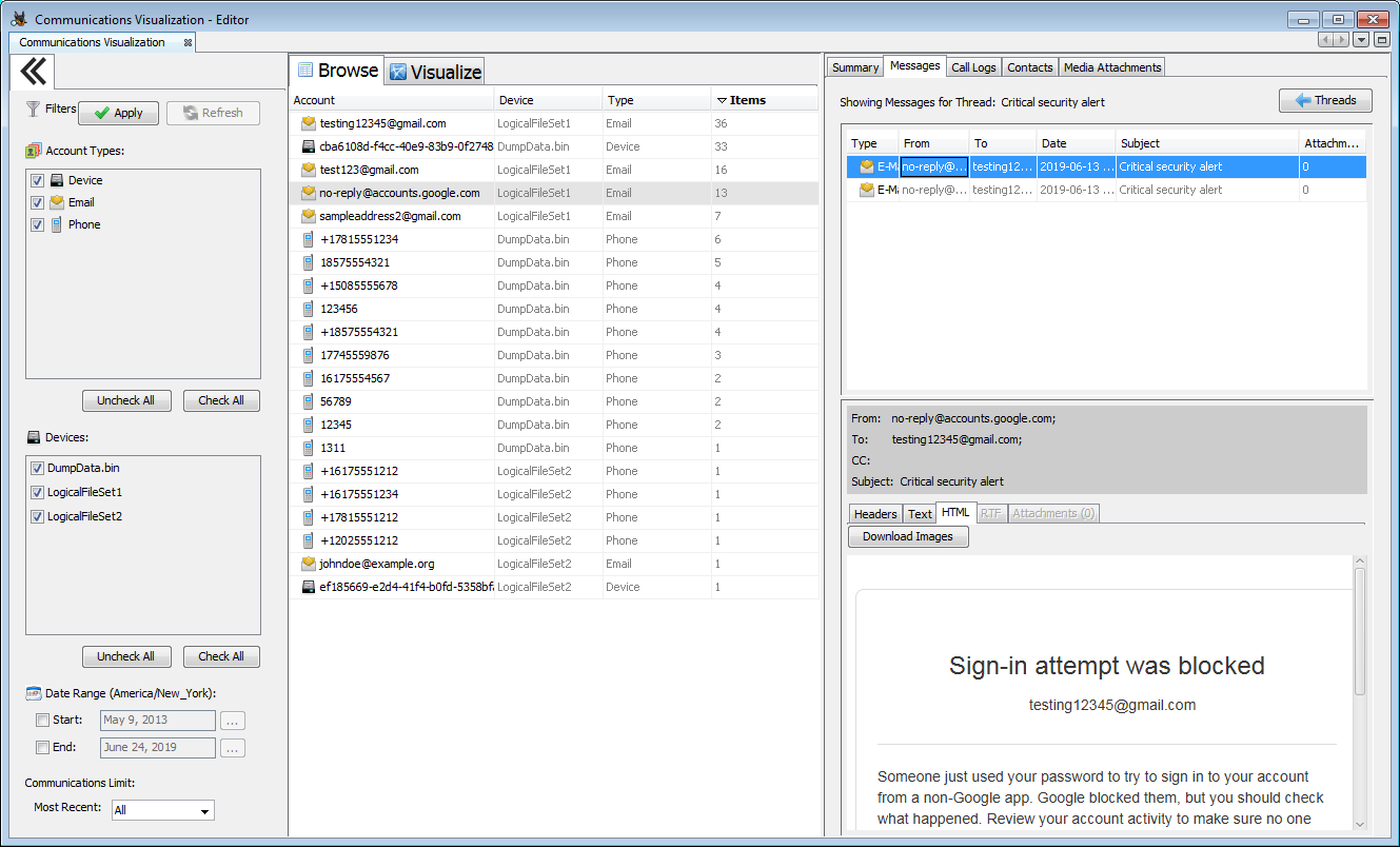 The Communications Visualization Tool gives a consolidated view of all communication events for the case. This allows an analyst to quickly view communications data such as: