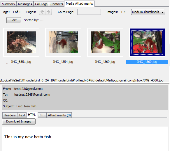 The Media Attachments tab shows thumbnails of any media files in messages for that account. If you click on one, it will show the message the media file came from.