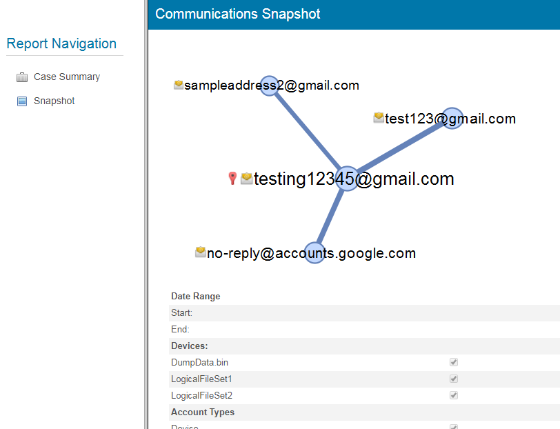If you click the "Snapshot Report" button, you can generate a report similar to the HTML report module. Select a name for your report, which will be saved to the "Reports" folder in the current case. The Snapshot Report will contain two pages. The first will have a summary of the case, and second will contain the current graph along with your filter settings.