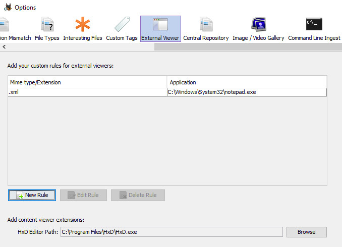 The top section allows you to enter custom file associations by either extension or MIME type. In the image above we've associated .xml files with the Notepad application. Now it is possible to right click on a .xml file in the results viewer and choose "Open in external viewer" to open that .xml file in Notepad.