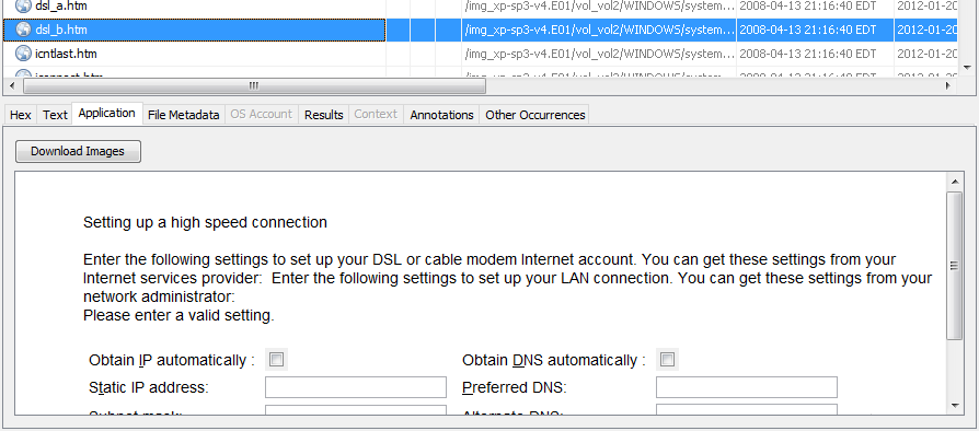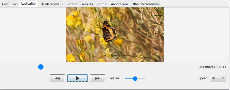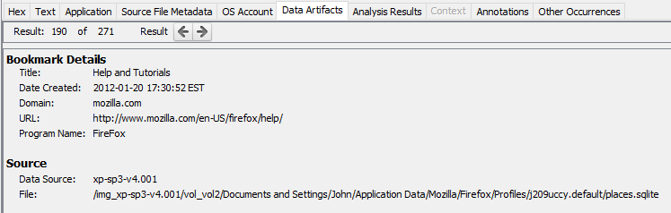 When a result item is selected in the Result Viewer (as opposed to a file), most of the tabs will correspond to the file associated with the result and not the result itself. For example, when selecting a keyword hit, the "Hex", "Strings", and "File Metadata" tabs will show data from the file where the keyword was found. The descriptions below will generally assume a file has been selected, but most also apply when we have a file associated with a selected result.