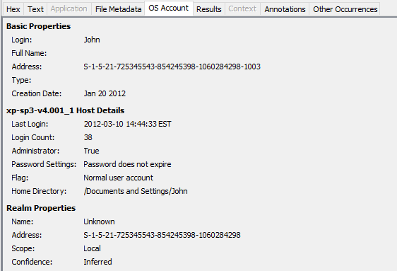 The OS Accounts tab displays information on the OS account associated with a given result, if present. It is also used to give details on accounts listed under the OS Accounts node in the tree.