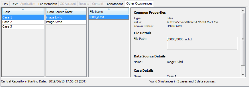 The Other Occurrences tab shows other instances of this file or result. Enabling the Central Repository adds additional functionality to this tab. See the Content Viewer section for more information.