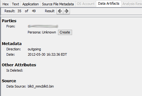 The Data Artifacts tab shows the artifacts associated with the item selected in the result viewer such as web bookmarks, call logs, and messages. The exact fields displayed depend on the type of data artifact. The two images below show the Data Artifacts tab for a call log and a web bookmark.