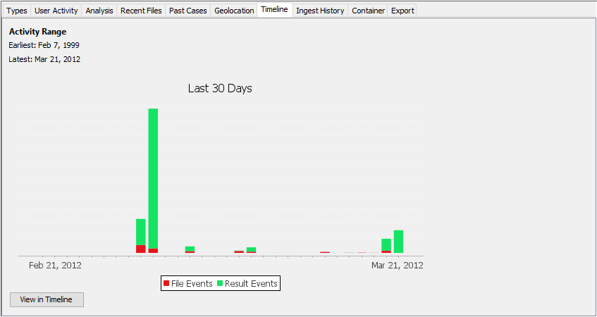 The Timeline tab shows a simplified version of the Timeline Viewer for the selected data source. It will show events for the last 30 days of activity in the data source and give the first and last dates of activity. "File events" represent file creation, modification, access, and change. "Result events" represent the results from running ingest, such as the time a message was sent or when a URL was accessed. The "View in Timeline" button will open the main Timeline Viewer.