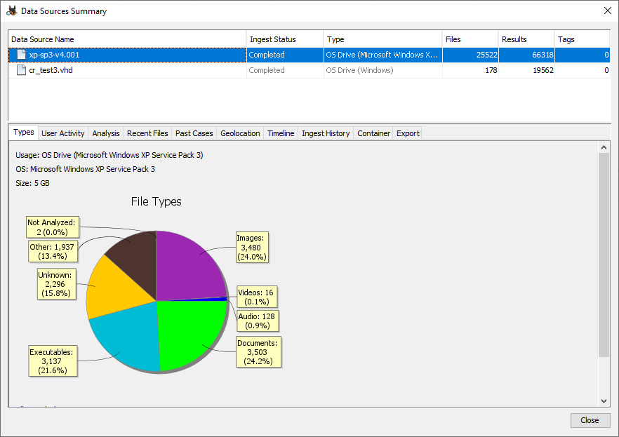 The Data Source Summary viewer allows you to see an overview of file types, results, and other information for a particular data source.