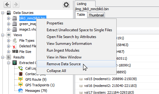 To delete a data source, right click it in either the Tree Viewer or the Result Viewer and select "Remove Data Source". If the case was originally created with a version of Autopsy earlier than 4.14.0 then this option will be disabled. After a confirmation dialog, the case will close and then reopen after the data source has been removed.