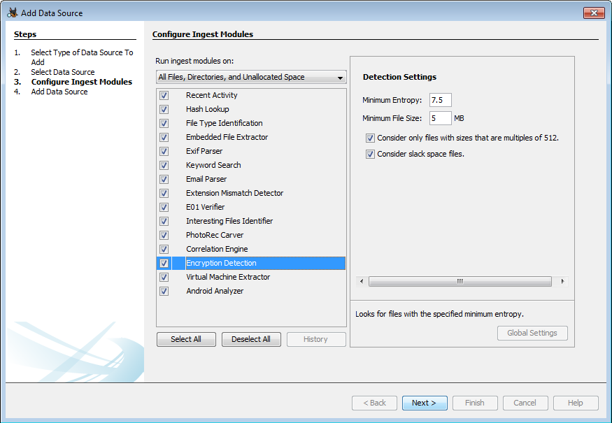 Minimum entropy can be set higher or lower, depending on how many false hits are being produced. There is also an option to only run the test on files whose size is a multiple of 512, which is useful for finding certain encryption algorithms.