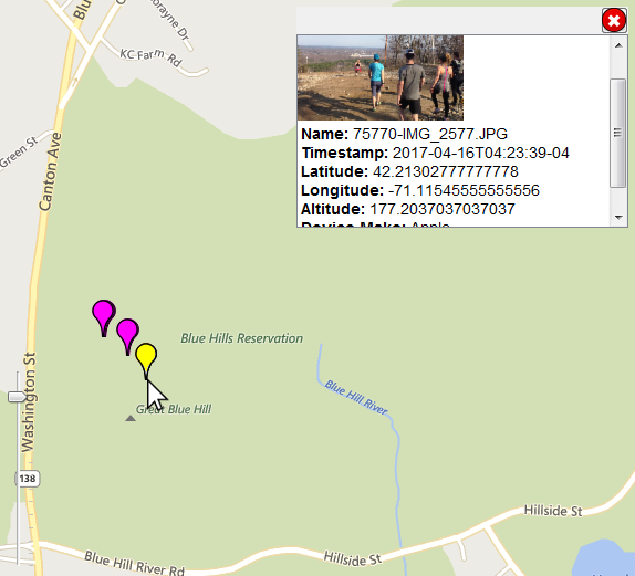 You can left click on a waypoint to highlight that waypoint and show a details pop-up in the upper right corner of the map. The details pop-up will be updated as you click on different waypoints. The data displayed will vary depending on the type of waypoint. For example, this is a GPS bookmark: