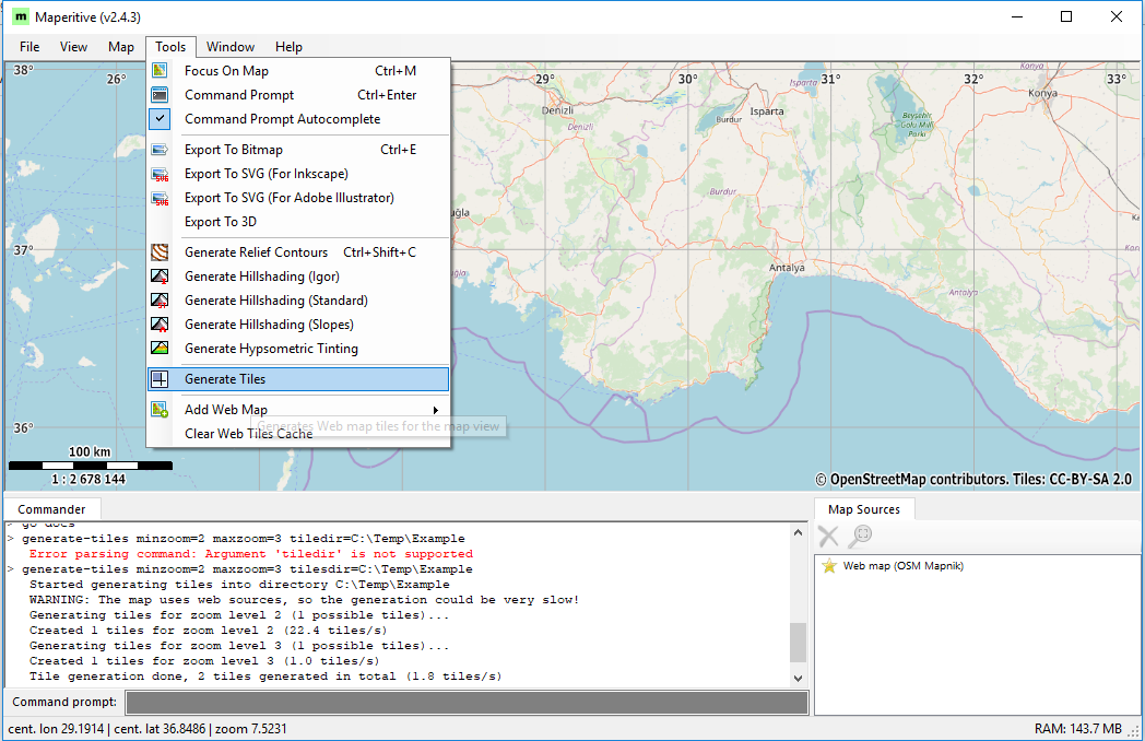 To generate tiles using the default zoom levels, select Tools->Generate Tiles