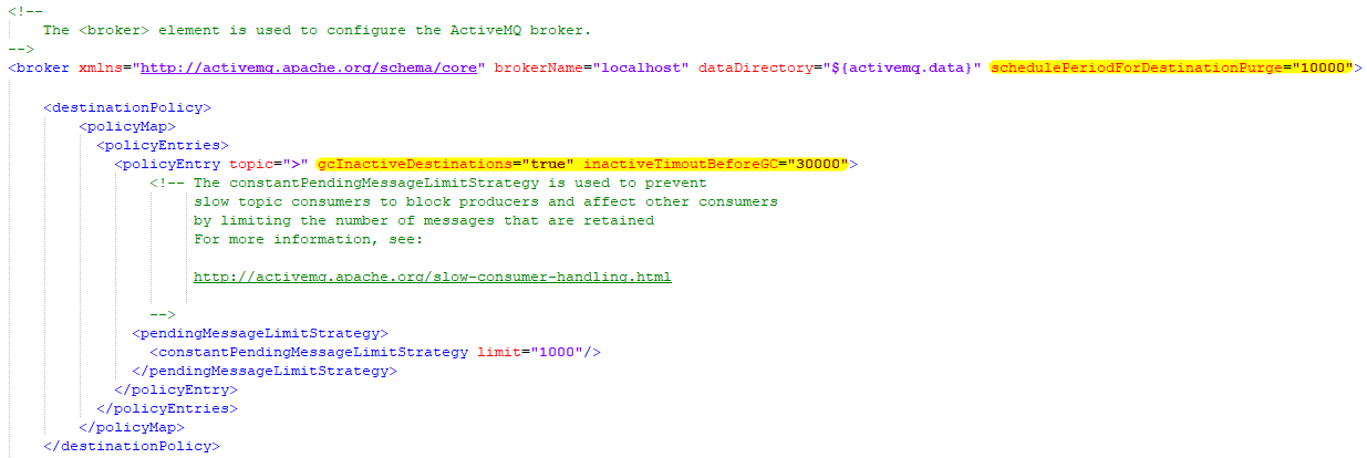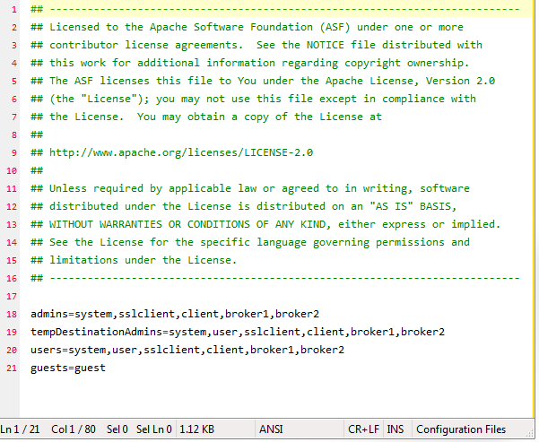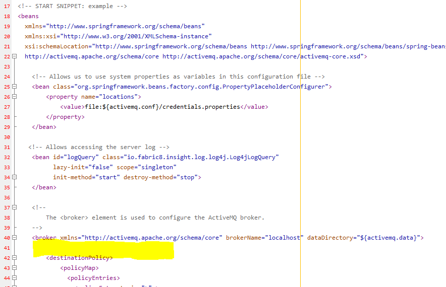 After insertion, the file should look like the screenshot below, with the inserted portion highlighted in yellow. This is where you can change the username and password for your ActiveMQ setup.
