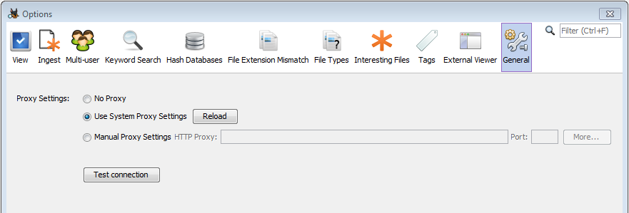 If you are behind a proxy and need access to a network with Autopsy or one of the modules, you may set your proxy information in the Tools, Options, General tab as shown in the screenshot below.