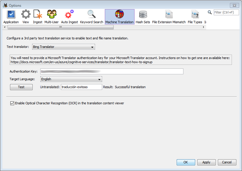 The checkbox at the bottom allows you to enable or disable optical character recognition (OCR). When enabled, if you select an image in the content viewer Autopsy will use OCR to attempt to extract text to be translated. Instructions for installing OCR packages for different languages can be found on the Keyword Search page.