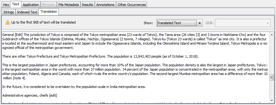 You can configure a machine translation service to use with Autopsy. If one is configured, you will be able to translate text in the Content Viewer and file names in the Result Viewer and Tree Viewer.