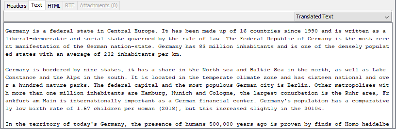 Switching to the Translation tab will display the results of running the text through the machine translation service.