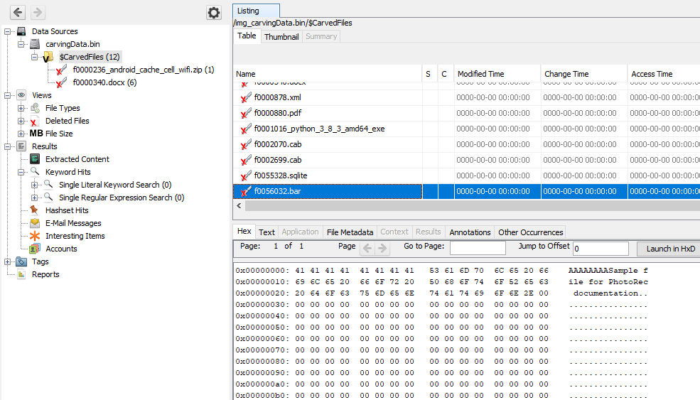The results of carving show up on the tree under the appropriate data source with the heading "$CarvedFiles".