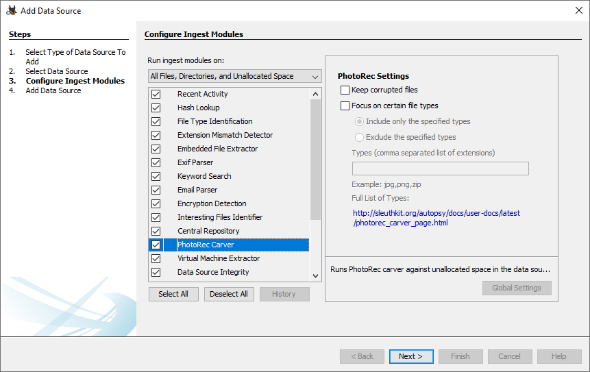 Select the checkbox in the Ingest Modules settings screen to enable the PhotoRec Carver. Ensure that "Process Unallocated Space" is selected.