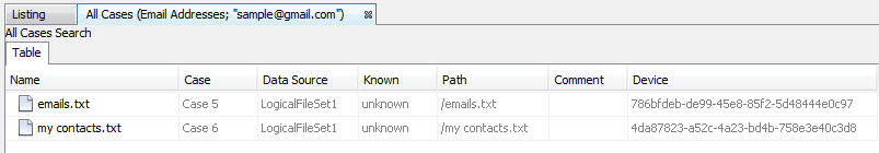 Once you hit the Search button, any results will be displayed in the Result Viewer. The tab title will display what was searched for ("Email Addresses" and "sample@gmail.com" in the example).