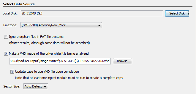 VHD is a file format used by Microsoft Virtual Machines that is readable by Windows and other forensic tools. The VHD will grow in size as Autopsy reads more data from the target drive.