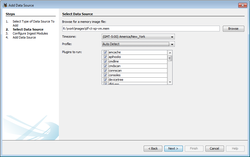 On the next screen, you can select your memory image and then adjust the settings to choose a profile and which Volatility plugins to run.