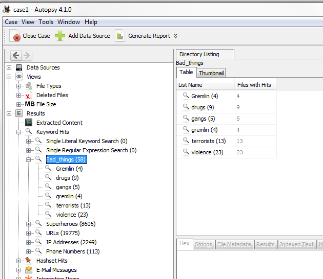 Individual keyword or regular expressions can quickly be searched using the search text box widget. You can select "Exact Match", "Substring Match" and "Regular Expression" match. See the earlier Creating Keywords section for information on each keyword type, as well as Limitations of Ad Hoc Keyword Search. The search can be restricted to only certain data sources by selecting the checkbox near the bottom and then highlighting the data sources to search within. Multiple data sources can be selected used shift+left click or control+left click. The "Save search results" checkbox determines whether the search results will be saved to the case database.