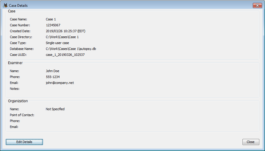Each case has its own directory that is named based on the case name. The directory will contain configuration files, a database, reports, and other files that modules generates. The main Autopsy case configuration file has an ".aut" extension.
