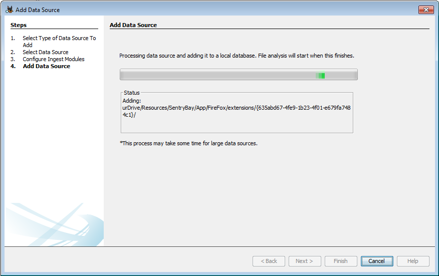 You will need to wait while Autopsy performs a basic examination of the data source and populates an embedded database with an entry for each file in the data source.