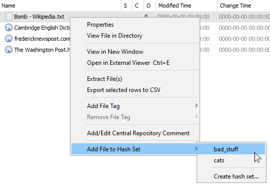 The other way to add an entry to a hash set is through the context menu. Highlight the file you want to add to a hash set in the result viewer and right-click, then select "Add file to hash set" and finally the set you want to add it to. Note that this does not automatically add the file to the list of hash set hits for the current case - you will have to re-run the Hash Lookup ingest module to see it appear there.