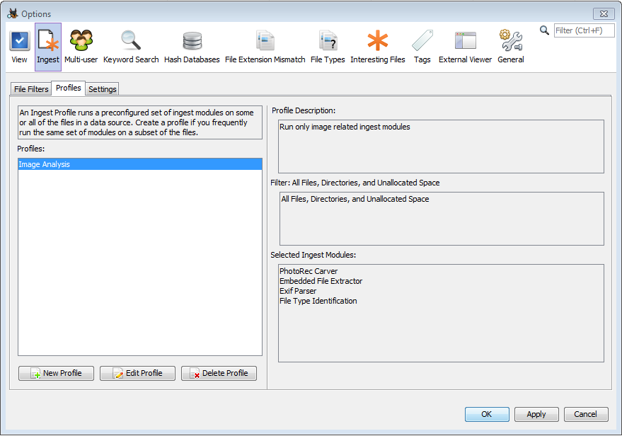 Ingest profiles allow you to quickly choose a defined set of ingest modules to run. This can be useful if you run different sets of ingest modules (or different configurations of those ingest modules) on different types of data. Ingest profiles can be configured through the Ingest tab on the options panel.