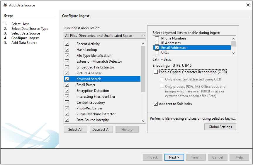 There is also a setting to enable Optical Character Recognition (OCR). If enabled, text may be extracted from supported image types. Enabling this feature will make the keyword search module take longer to run, and the results are not perfect.