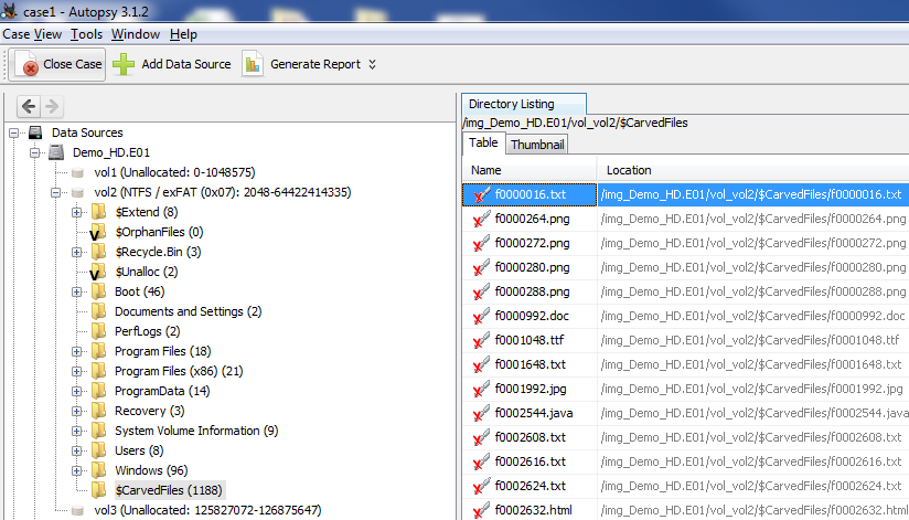 The results of carving show up on the tree under the appropriate data source with the heading "$CarvedFiles".