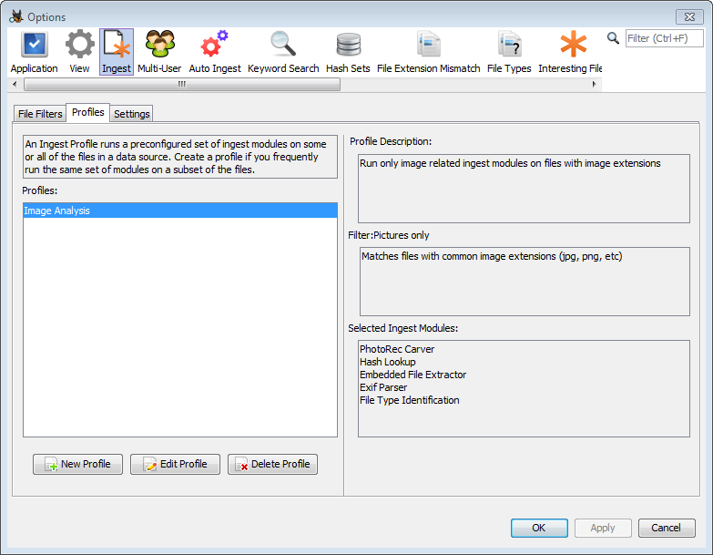 Another way to speed up analysis is to only run some of the ingest modules. For example, if we're only interested in images, there may be no point in running the Keyword Search Module or the Encryption Detection Module. You can manually select and configure the modules you want to run each time, but since many sessions are similar it may be easier to set up an ingest profile. An ingest profile allows you to store which file filter you want to run, which ingest modules should be enabled, and your configuration for each ingest module.