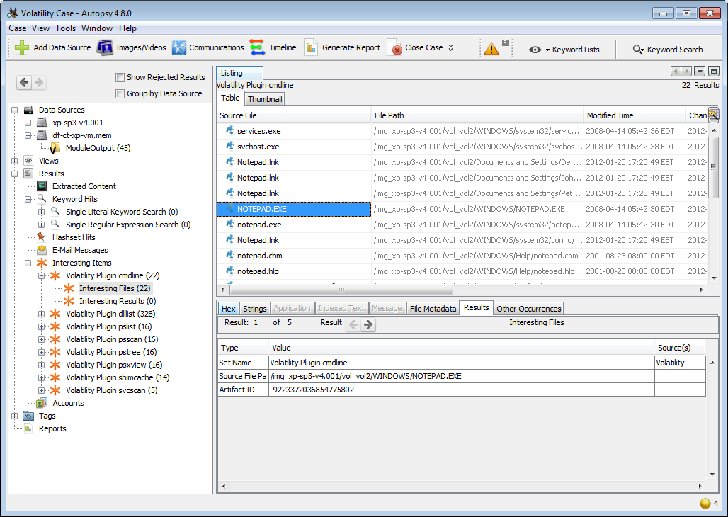 The Volatility data source processor runs Volatility on a memory image and saves the individual Volatility module results. If the disk image associated with the memory image is also available, it will create Interesting Item artifacts linking the Volatility results to files in the disk image.