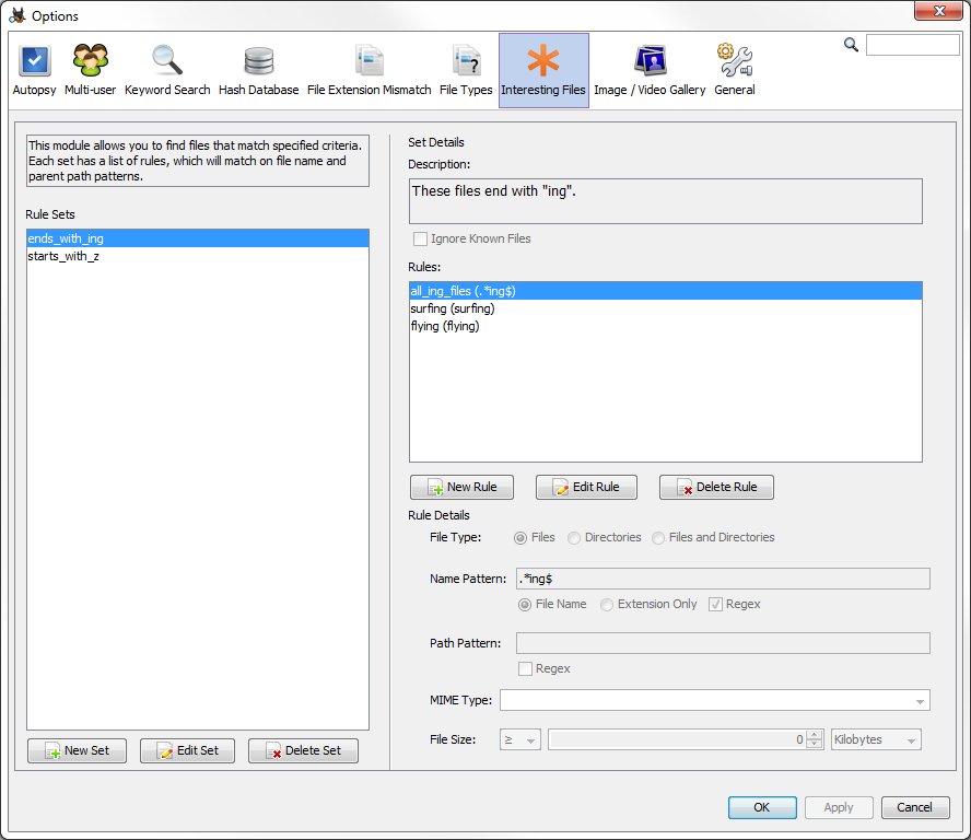 When you enable the Interesting Files module, you can choose what rule sets to enable. To add rules, use the "Advanced" button from the ingest module panel.
