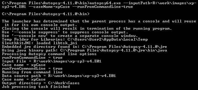 In the example below, we're going to process a disk image with path "R:\work\images\xp-sp3-v4.E01" and name the case "xpCase".