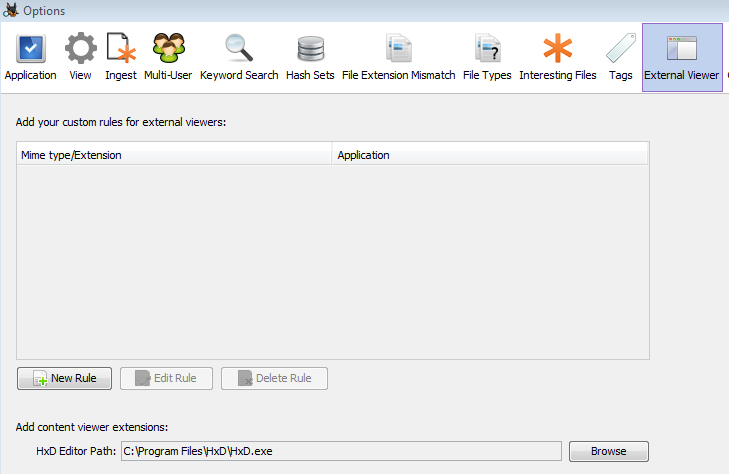 If desired, you can open the file in an external hex editor. This is configured through the "External Viewer" tab on the options panel. HxD has been verified to work with Autopsy, but alternate hex editors may also be compatible.