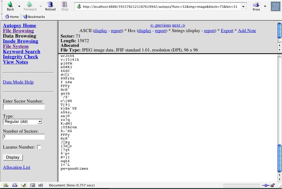 It was noticed that the size of the jpg file was reported to be 15585 bytes, which would require ((15585 + 511) / 512) = 31 sectors. That matched the length of the 73-103 sector chain. The sector chain was viewed in Autopsy (from the 'File System' link), which reported a file type of JPEG image data. 'strings' was run on it next to identify embedded information. At the bottom of the file, the 'pw=goodtimes' string was noticed ( screen shot). This could be the password we were looking for. The sectors were exported and the following MD5 was calculated:
