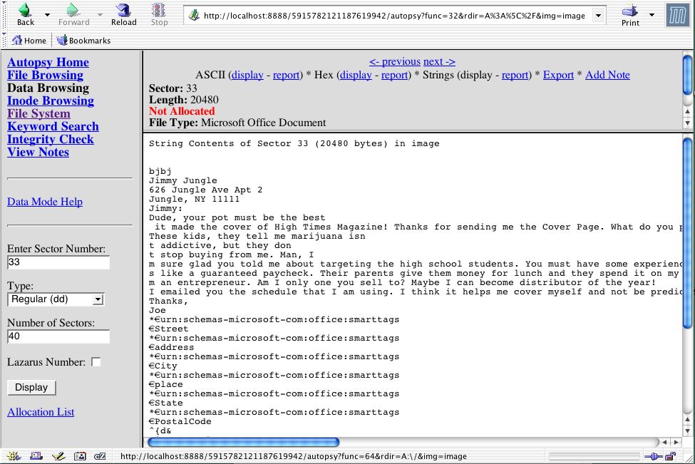To extract the data, the 'Data Browsing' link was selected and '33' was entered as the sector number and '40' as the number of consecutive sectors. This extracted 40 sectors, starting at number 33. The result was both binary and ASCII values, but text from a letter to 'Jimmy Jungle' about the quality of pot could be seen. To remove the binary values from the output, the 'strings' link was selected (screen shot).