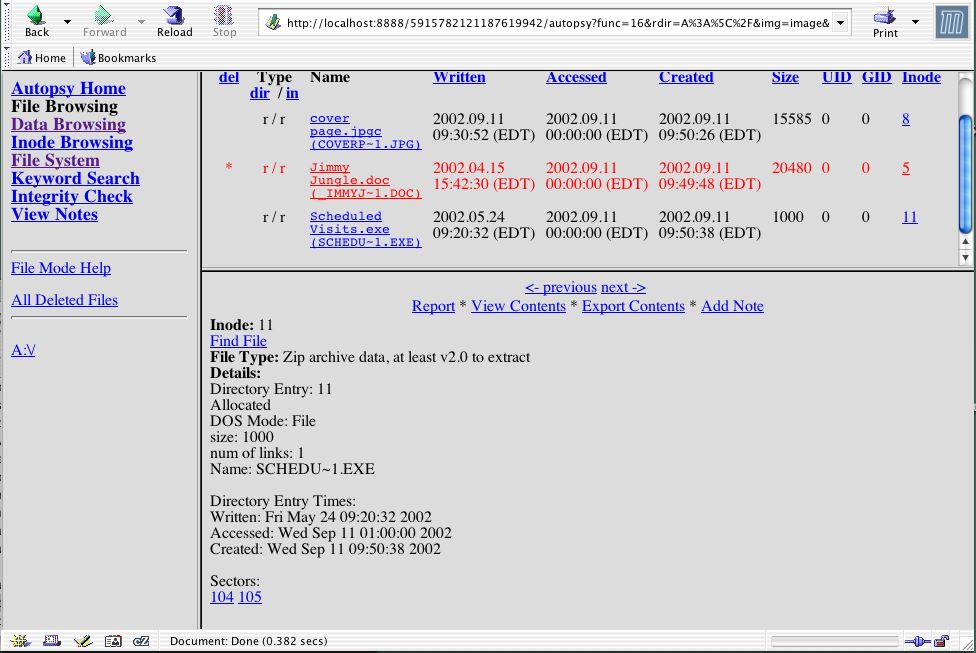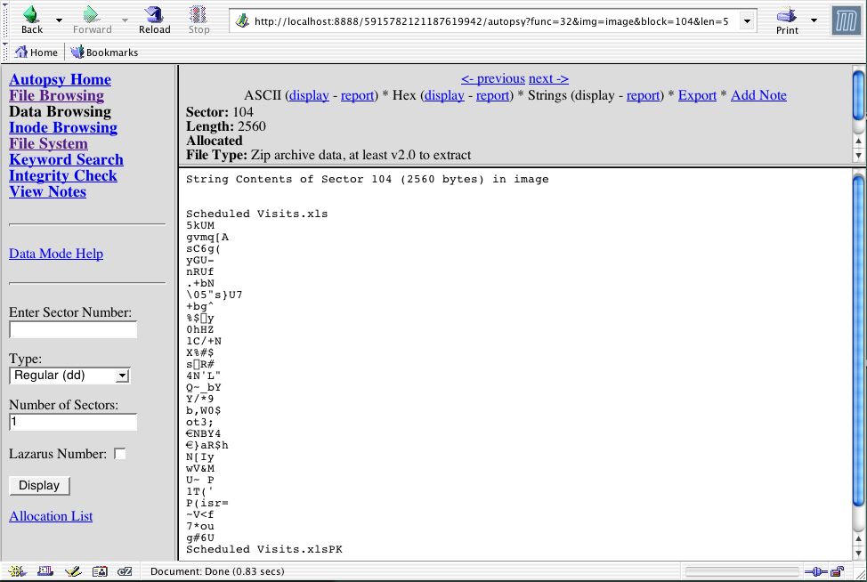 The 'File System' mode was used and the 104-108 (5) link was selected (this is the equivalent of using 'Data Browsing' mode and extracting 5 sectors starting at 104). 'strings' was used to identify embedded information and the string Scheduled Visits.xls was seen twice (screen shot). That could be the name of the file in the archive. 'Export' was used to save the file to disk. It can be found here and has the following MD5: